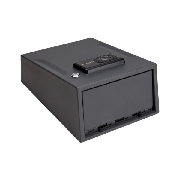 Keep your handgun secure yet easy to access with the Hornady Keypad 1-Gun Handgun Vault. This Hornady gun vault boasts a 4- to 6-digit keypad lock to secure your firearm, accepting up to 1911-size pistols and up to 4″ revolvers. A spring-loaded door ensures quick access to your pistol. The thick 16-ga. steel is pre-drilled for easy mounting, and its premium foam interior protects your pistol. Interior lighting automatically turns on when you open the gun vault, and it includes a backup barrel key lock with 2 keys. Select between audible and visible low-battery indicators so you know when it’s time to change the 4 AAA batteries (not included) that are required for operation. Exterior: 5.25″H x 9″W x 12.7″D. Interior: 3″H x 8.6″W x 11.4″D.Manufacturer model #: 95433. 4- to 6-digit keypad and a spring-loaded door Backup barrel key lock with 2 keys Fits up to 1911-size pistols and up to 4″ revolvers Thick 16-ga. steel construction is pre-drilled for mounting Premium foam interior with automatic lighting Choose between audible and visible low-battery indicators