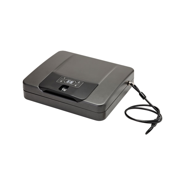 Designed to secure up to 2 full-sized handguns or 1 large revolver, the Hornady RAPiD Safe 4800KP Pistol Vault has a keypad that offers a secondary entry method where the user can program a 4 to 6 digit security code in addition to the RFID-enabled access methods. Multiple touch-free access options allow you to open the handgun safe with a RFID bracelet, RFID stickers, RFID key fob, or with a conventional key lock. When activated by the security code or RFID, the spring-assisted lid opens instantly. The RAPiD Safe 4800KP exceeds ASTM International performance standards for youth-resistant firearms containers, and complies with California DOJ required standards for firearm safety, as well as TSA regulations. The exterior of the gun safe is made of 14-gauge steel with 2 internal hardened locking lugs. The lid opens with AC power or battery power (batteries not included) to ensure your handgun is ready to go 24/7. A security cable allows you to fasten the safe down virtually anywhere. The Hornady RAPiD Safe 4800KP Portable Gun Safe includes: RFID wristband, 2 RFID stickers, RFID key fob, 2 circular barrel keys, wall power supply, and security cable. Up to 5 RFID tags can be programmed to open the safe. Multiple touch-free RFID access options Additional keypad opens with security code Back up conventional key lock Spring-assisted lid 14-gauge steel Includes security cable AC power with battery back up Includes RFID wristband, stickers, and key fob Complies with ASTM International standards Complies with CA DOJ and TSA regulations